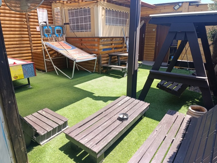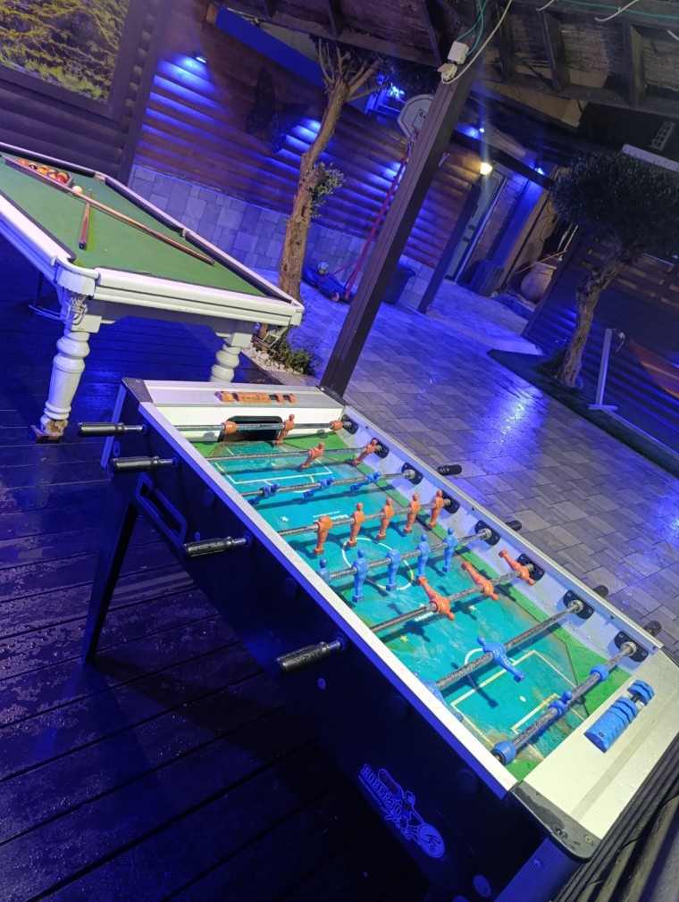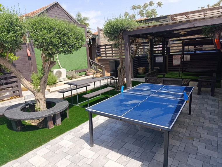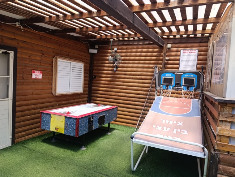 אווירת גן בוסתני עם עצי זית ופרחים מסביב .טרמפולינה ענקית.קונסולת משחקים ,שולחן טניס פינג פונג , שולחן הוקי אוויר מקצועי, חדר סנוקר.ערסל.נדנדה.פינת מנגל .פינת חי.(משק חקלאי) מערכות ישיבה כפריות.2 מתחמי ג'קוזי ספא חיצוני מוצנע ומקורה , מכשירי כושר מקווה לגברים